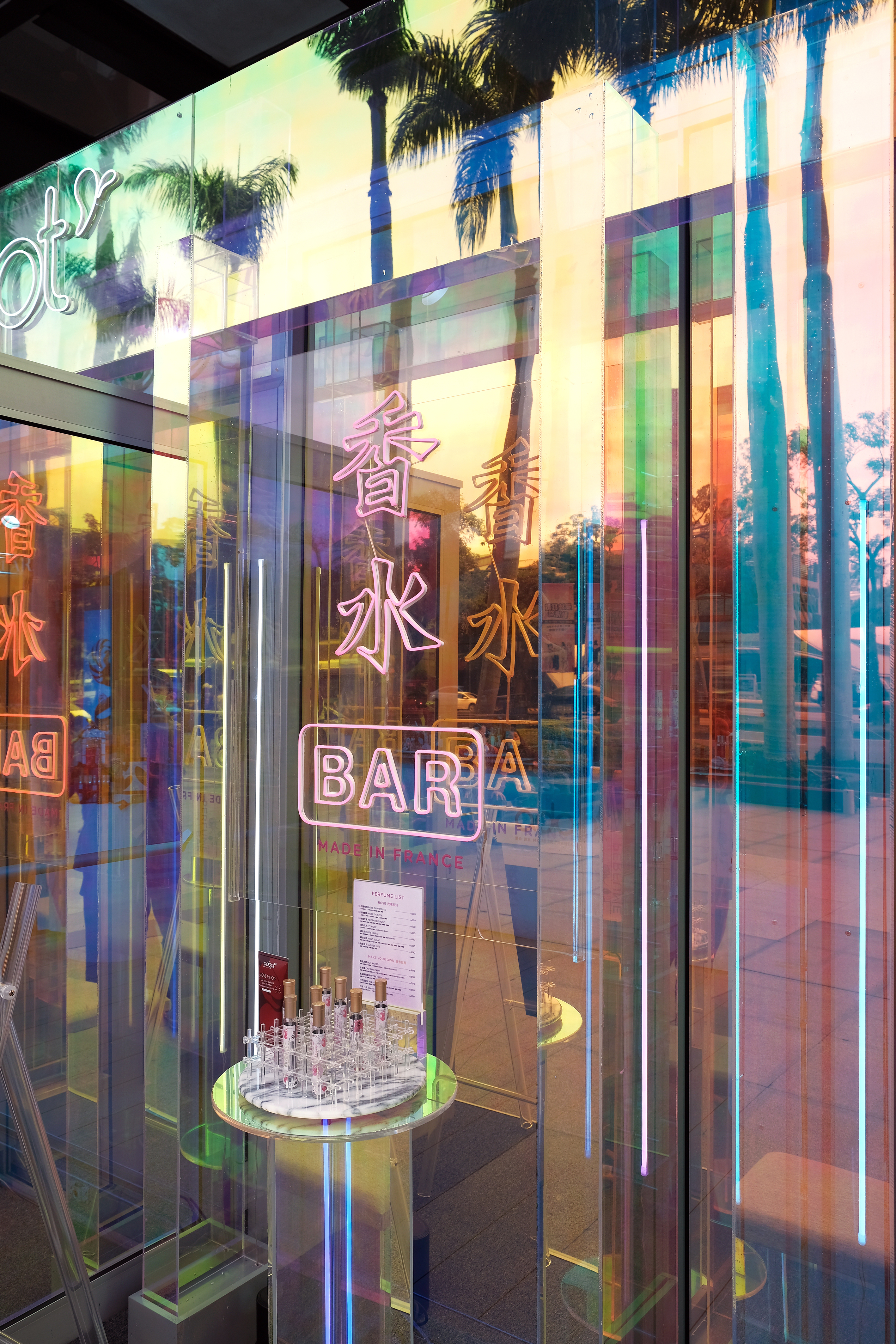 將繽紛香水瓶置入炫彩玻璃酒吧之中,並以調酒層疊交融的